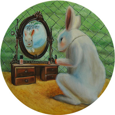 这幅油画描绘了一个在梳妆打扮的兔,美丽的兔生活的安逸的环节中,用着高档的化妆品,地上铺着地毯,外面有大片的草坪,构筑了一如梦的生活理想。