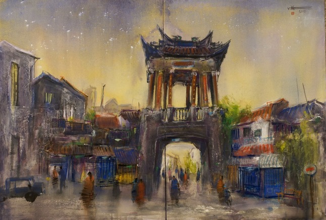 写画地点:台湾高雄.美浓媒材规格:硅酸钙板、水彩中和庄第十四双和美展( 2010全国征件)大专社会组-佳作东门楼,为美浓镇最具历史价值的古迹,简单的水泥构造,有极简主义的禅意。