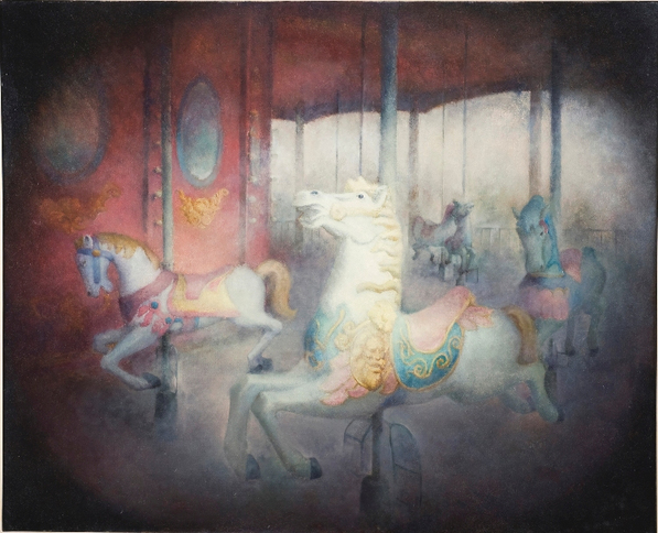 畫中游乐场的场景是作者童年记忆缺失的一部分,作者的童年几乎与游乐场无缘,以至于他成年后走进游乐场竟萌发了一种难以言喻的情绪,就如遇见了一位自己心仪的姑娘,虽有终于得以相遇的欢欣,却总也因为错过了彼此的过去而懊恼不已,而试图去做些什么来弥补这段记忆的缺失。这种情绪在作者内心萌发,涌动,从起初的若隐若现渐渐转化为异常明确,于是他开始了这一主题的创作,在画布上作者独自在静寂的游乐场中徘徊穿梭,乐此不疲。