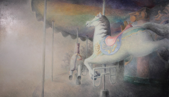 畫中游乐场的场景是作者童年记忆缺失的一部分,作者的童年几乎与游乐场无缘,以至于成年后走进游乐场竟萌发了一种难以言喻的情绪,就如遇见了一位自己心仪的姑娘,虽有终于得以相遇的欢欣,却总也因为错过了彼此的过去而懊恼不已,而试图去做些什么来弥补这段记忆的缺失。这种情绪在作者内心萌发,涌动,从起初的若隐若现渐渐转化为异常明确,于是作者开始了这一主题的创作,在画布上独自在静寂的游乐场中徘徊穿梭,乐此不疲。