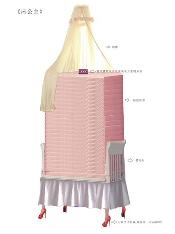 脍炙人口的经典童话故事《豌豆公主》里,一百层被子下面藏着一颗豌豆,之一公主的娇嫩皮肤才能够感知。童话赋予公主的特殊体质,长久以来为儿童向往与崇拜,是好是坏?我创作的这件作品中,床腿为儿童尺寸的脚代替,并穿上高跟鞋,层层叠叠高过头顶的被子让人感到距离。被褥里的录音装置仿佛那颗豌豆,循环播放女孩稚气谈论公主的声音。女孩们的声音,好像是床在说话,也或许是女孩被困进了被子,被困进了童话?希望大家通过我的作品,会重新思考儿童与儿童所处的世界。