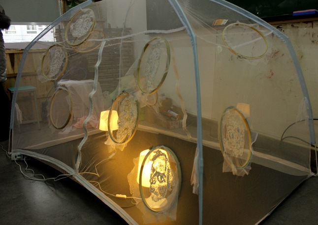 是一个普通的家用蚊帐,但是对蚊帐进行修剪,并刺绣,利用线的疏密刺绣出一个个生动的表情。上面的圆形为刺绣用的竹崩子。运用传统元素,但又是当代艺术感的作品。