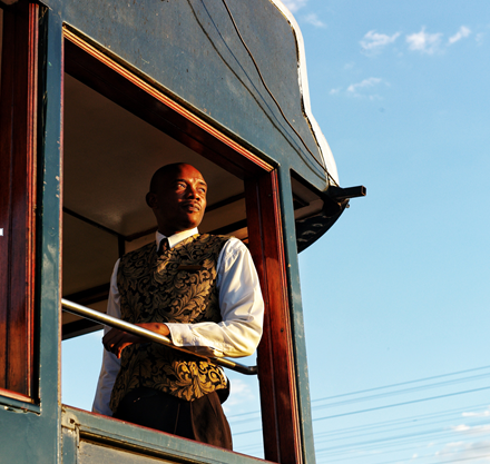 摄于赞比亚百年历史的利文斯顿皇家列车。列车在落日黄昏时分停靠在维多利亚瀑布旁,一名黑人侍者凭栏远眺苍茫时刻。
