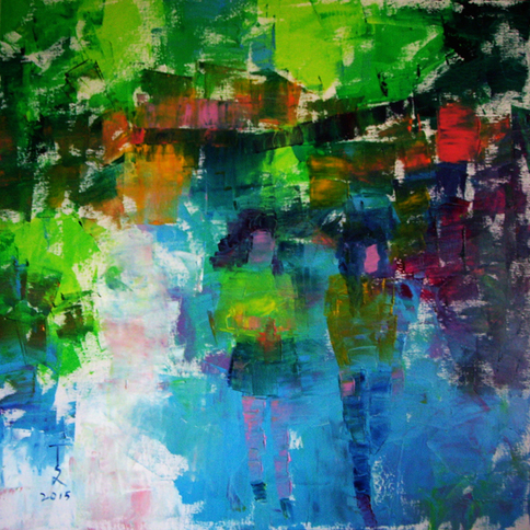 夏日的田子坊,好似悄然从睡梦中醒来的海上佳人,阳光、阴影、小店……把往事与现今巧妙地融合在一起,宛若时光交错,斑驳迷离的色彩浑然天成。当你一不小心踏入其中,你就会懂得上海人的那份怀旧、精致与包容。随物赋形,尽水之变是永远的法则。 “田子坊系列”是我近期的代表作品,画作中运用了大面积的纯色来描绘现代都市与都市人的时尚与宣泄,随心所欲的用笔放纵而自然,力图给观者带来视觉上的冲击力和独特风格的享受。“意彩油画”是我对这一系列作品的系统性归纳,强调了它来源于中国传统写意精神和西方油画对色彩诠释融合后所产生的新绘画风格。