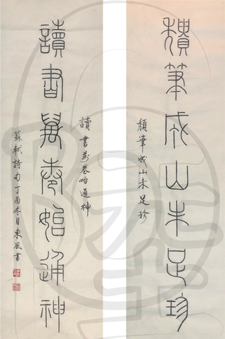 内容:颓笔成山未足珍,读书万卷始通神。(选自《柳氏二外甥求笔迹》)苏轼。字体:小篆。未裱。纸面:纯白宣纸。作品无水印。单张规格:135cmx34cm。共两张。