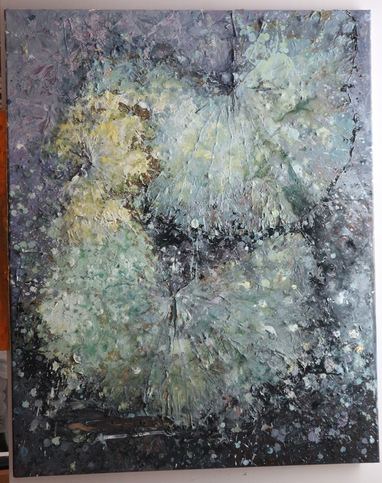 平时喜欢尝试用一些综合材料进行创作,尤其是有肌理感的材料。这次接触到荷叶,缘于去西塘游玩赏荷,便想着尝试荷叶作画。发现了荷叶的独特之处,于是决定将荷叶作为画布,触摸它的脉络,寻找适合与之相结合的绘画材料,由于特殊的肌理,最终选择了丙烯颜料。 画作意境:在创作的过程中是轻松有趣的,闭眼想象夏天雨后荷叶上布满水珠,阳光透过云层,荷叶边缘透着微光。