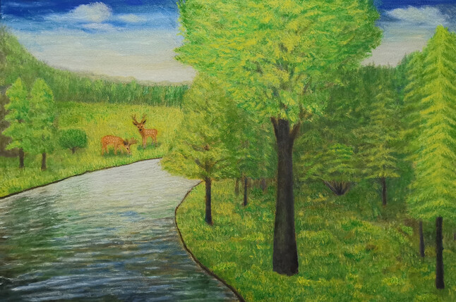 愿我的原创绘画给您带来愉悦健康和思想!鹿在中国是吉祥物,鹿与禄同音,福禄寿是人们的美好愿望!鹿只有生活在空气新鲜,水质优良,植被丰富的环境中才能称为福鹿!此画是按中国古代风水学原理和美学原理以及养生学原理创作的,有一定的养生健身作用,常看此画可使人心情愉悦健康长寿!本人长年定制油画风景油画肖像,价格可商议,画的效果为古典风格,是理想中的美,希望您喜欢!欢迎惠顾!