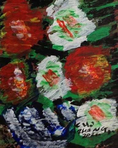 标题:《静物花卉》。木板贴纸设色。综合颜料。